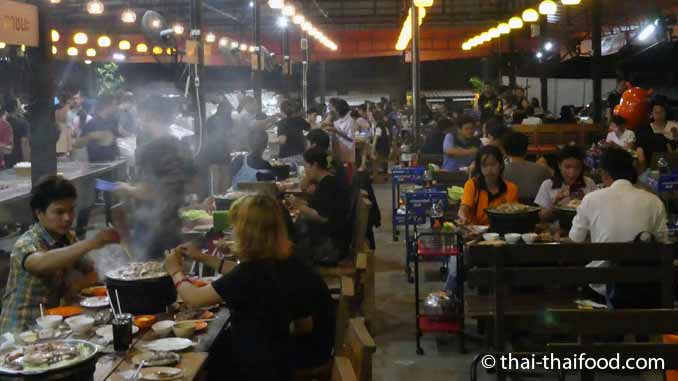 ▷ In Thailand gibt es zahlreiche „All-you-can-eat“ MooKata Restaurants, die bei den Thais sehr beliebt und immer gut besucht sind. Überall in diesen Restaurants qualmt und raucht es von den vielen Tischgrills die dort in Betrieb sind.